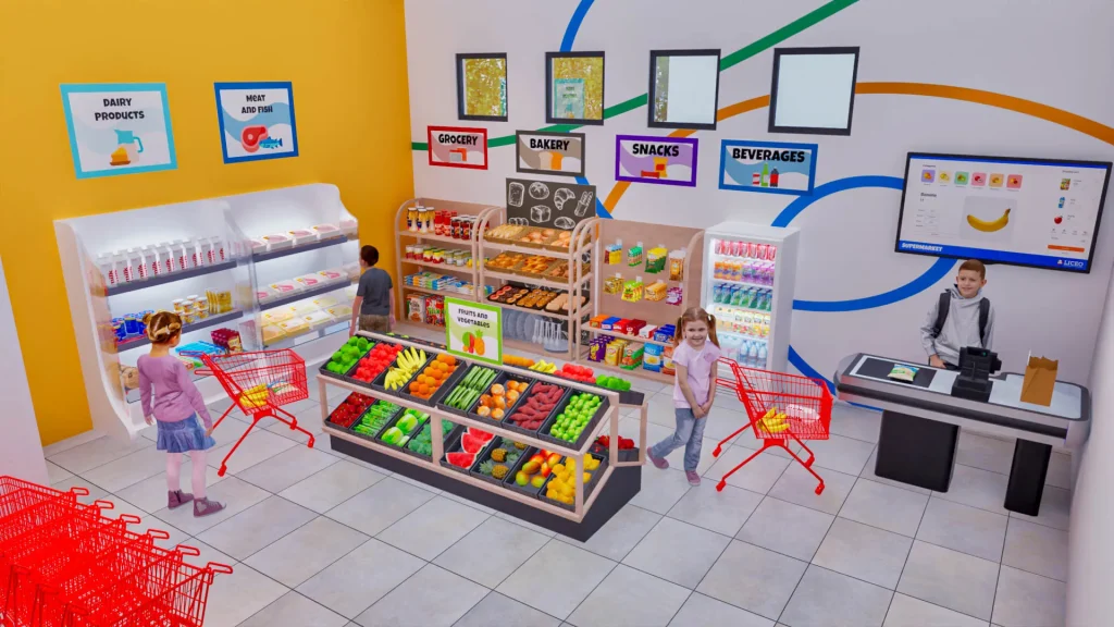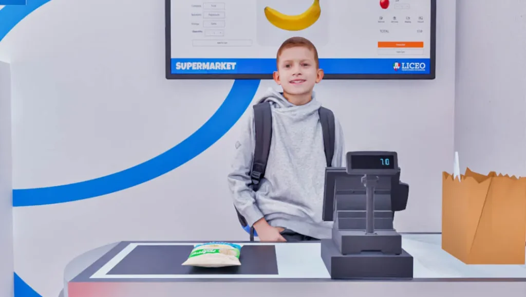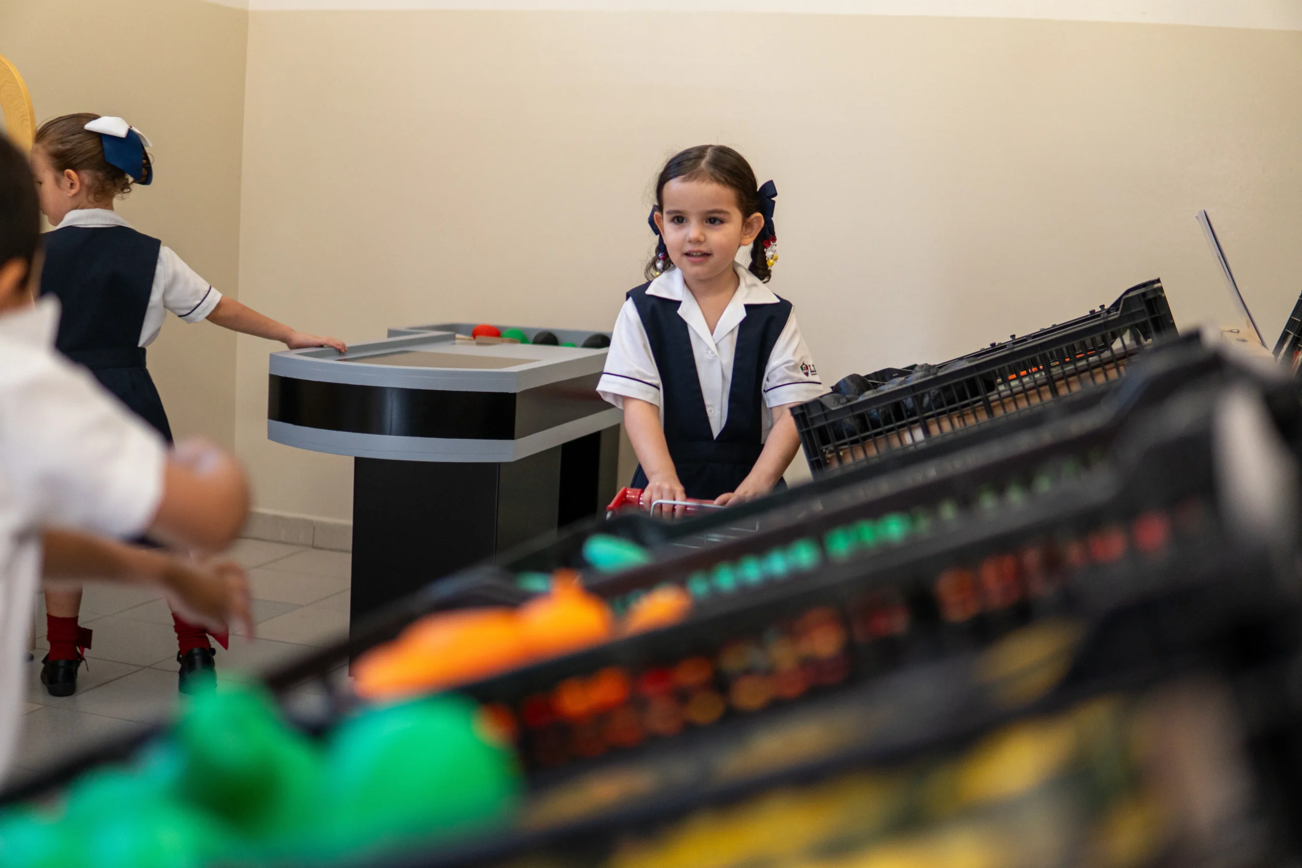 Los niños viven la experiencia de un mini supermercado, donde desarrollan habilidades matemáticas, sociales y de toma de decisiones mientras juegan a ser compradores y vendedores en un entorno realista.